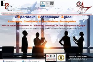 Toutes ces questions vont être discutées lors d’un séminaire de formation sur le thème : L’opérateur Economique Agrée : Avantages, Conditions et Facilitations Escomptées qui sera organisé par l’ Ecole Pratique de Commerce les 30 et 31 Mars 2022 à son siège, suivi d’un ATELIER TECHNIQUE sur "les Nouvelles Conventions de Libre échange avec l’Afrique» qui sera tenu le 01 Avril 2022.